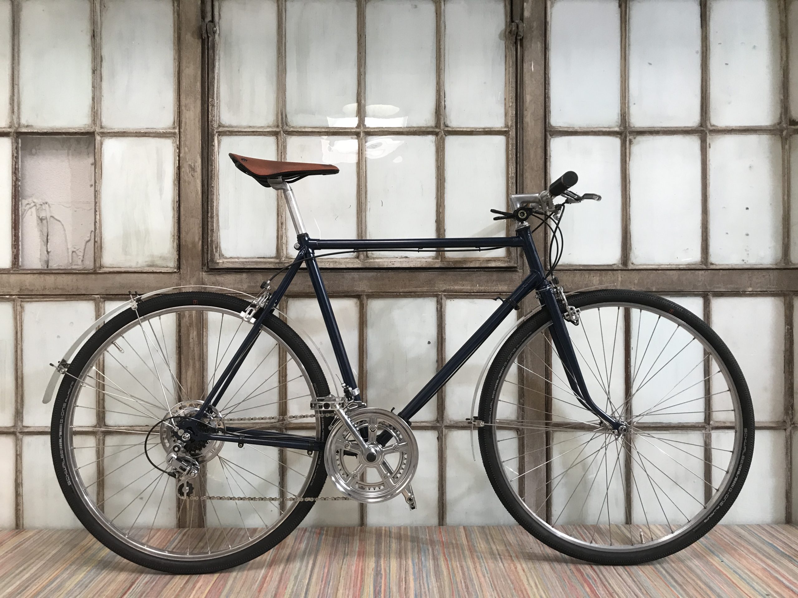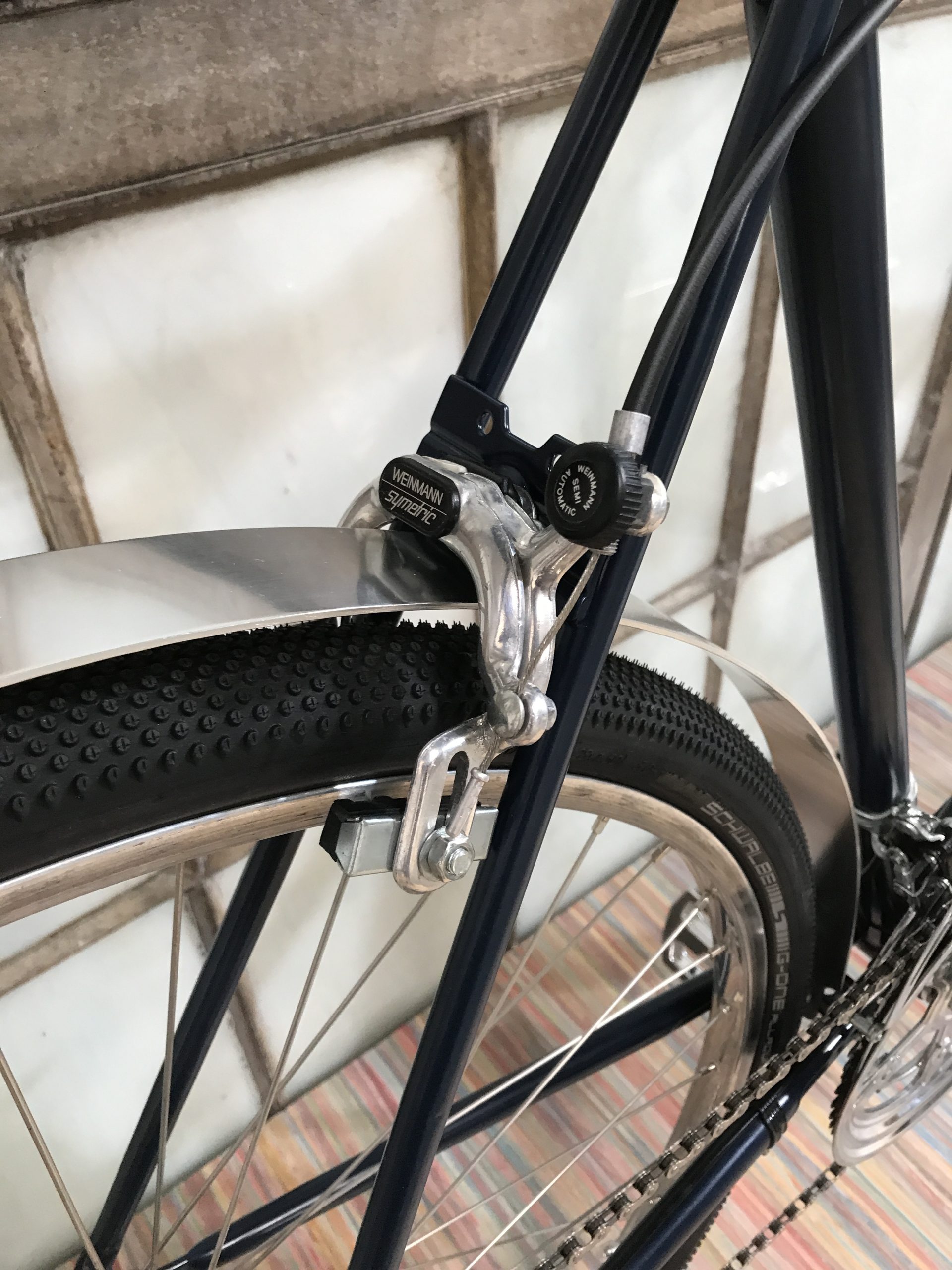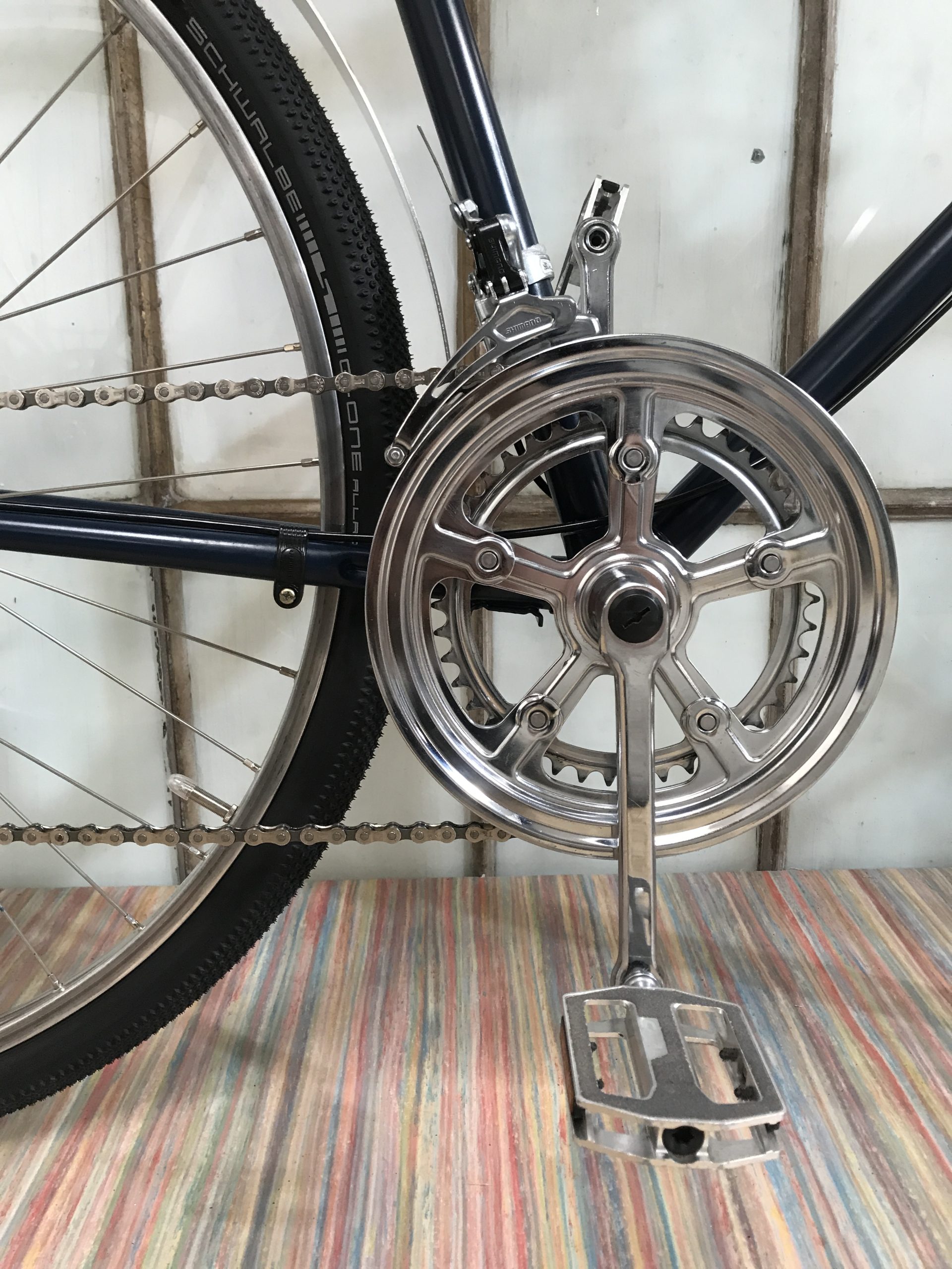 UR 0 war ein echter Hingucker unter meinen Freunden. Einem gefiel es sogar so gut, dass er auch so eine Bike wollte, nur etwas weniger Racing und mehr Alltagstauglichkeit. Ein schöner Stahlrahmen war schnell gefunden, der wurde gestrahlt und in Stahlblau RAL 5011 gepulvert. Die ursprüngliche Schaltgruppe – eine Shimano Positron – erwies sich als sehr kompliziert zum Einstellen (sie hat sich wahrscheinlich deshalb auch nicht durchgesetzt). Als Alternative haben wir eine Shimano 600er Gruppe ausgewählt. Wir haben alle Lager getauscht und sämtliche Alu-Teile: Felgen, Bremsen, Kurbeln, Kettenschutz etc. haben wir gereinigt und aufpoliert. Sie waren alle noch tadellos und nach der Aufbereitung wieder wie neu.